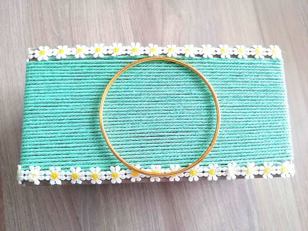 Βάζουμε λίγη κόλλα στο σημείο έναρξης και τυλίγουμε γύρω γύρω από το κουτί την κορδέλα. Ενδιάμεσα, βάζουμε ξανά κόλλα για μεγαλύτερη σταθερότητα.